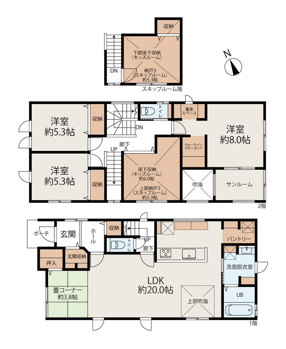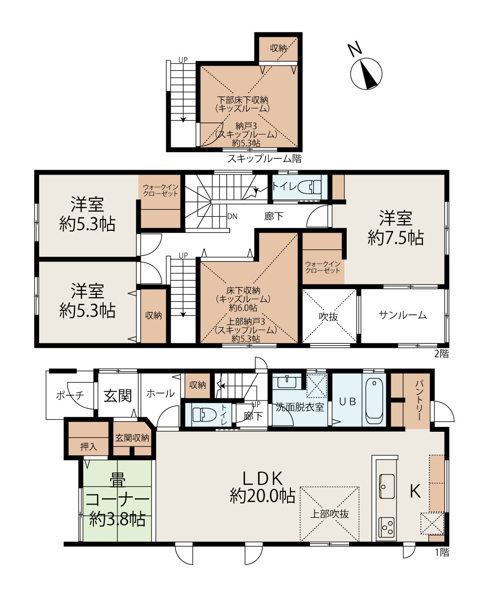 リビングは広々20帖!隣には畳コーナーもあり、開放感のある造りになっています。